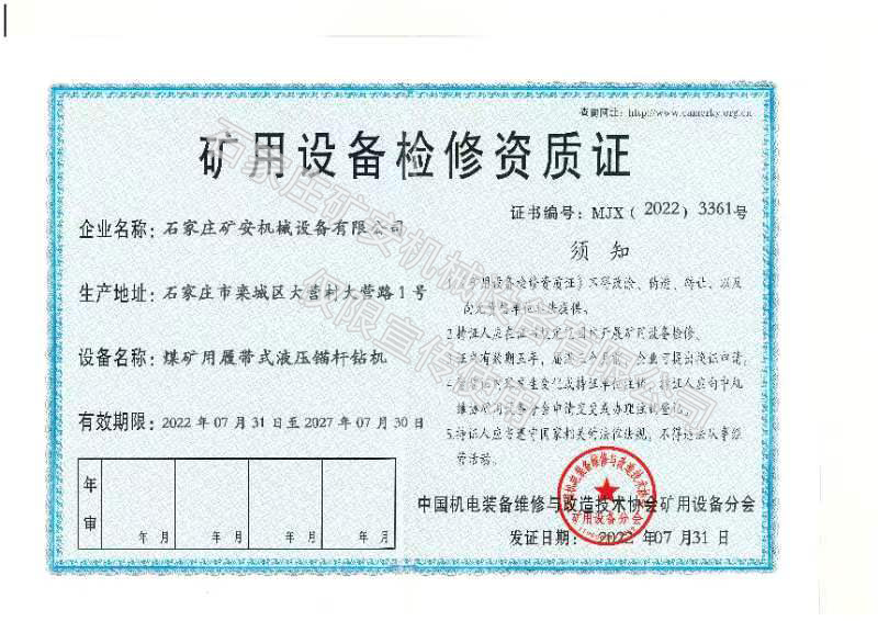 石家莊礦安機械設備有限公司成立于2011年3月,公司位于風景優(yōu)美、科技發(fā)達、交通便利的石家莊市欒城區(qū),是一家專注生產(chǎn)煤礦井下支護機具(錨桿鉆機)和安全鉆機(防突,架柱等)及氣動隔膜泵等礦用機械設備的********,是國內(nèi)煤礦機械裝備的生產(chǎn)商和服務商,根據(jù)用戶需求提供井下適用的鉆機施工解決方案。公司致力于打造研發(fā)、制造、銷售、服務為一體的現(xiàn)代化企業(yè),全心全意為煤礦生產(chǎn)保駕護航。 ? 公司建有裝配車間、機加車間和調(diào)試車間,擁有嚴格的質(zhì)量控制體系、先進的產(chǎn)品開發(fā)系統(tǒng)、完善的試驗檢測設施、良好的售后服務保障。先后與中煤科工集團沈陽研究院、西安研究院、太原理工大學、燕山大學等知名院校建立了緊密的合作關系。 ? 公司產(chǎn)品主要銷往山西、陜西、山東、內(nèi)蒙古、黑龍江、云南、貴州等七十多個礦區(qū)和地方煤礦,擁有一支成熟的售后技術團隊,并且和中煤集團、華電煤業(yè)集團、華潤煤業(yè)集團、潞安集團、山西焦煤、淮北礦業(yè)等國內(nèi)知名企業(yè)達成長期合作關系。 ? 公司始終秉持“讓煤礦生產(chǎn)更安全”的發(fā)展使命,力求誠信與創(chuàng)新,追求卓越與完美,深知“實實在在、心無旁騖做實業(yè)”,這才是本分!石家莊礦安機械設備有限公司愿與您攜手共進,共同發(fā)展!為客戶創(chuàng)造價值,提供優(yōu)質(zhì)的產(chǎn)品和*佳的服務是我們永無止境的理念!